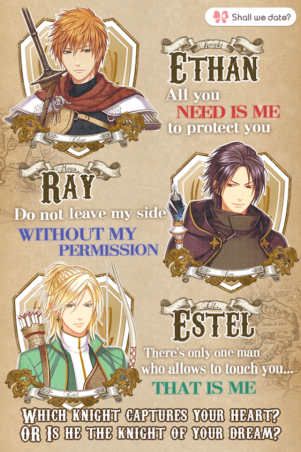 - Chọn nhân vật yêu thích của bạn: hiệp sĩ đẹp trai người sẽ nắm bắt trái tim của bạn! Bạn có thể lựa chọn trong số ba người đàn ông bắt đầu lãng mạn của bạn.